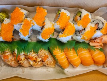 Mixed sushi and rice paper rolls, with dipping sauce.