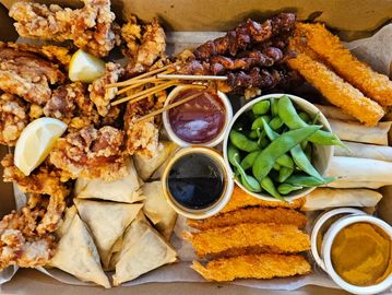Serves 6–8 people. Karaage chicken, chicken satay, vegetarian samosas, mini spring rolls, bread crumbed prawns, edamame beans.